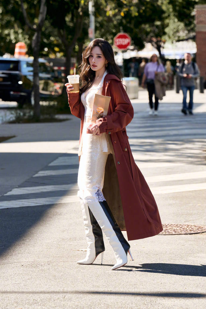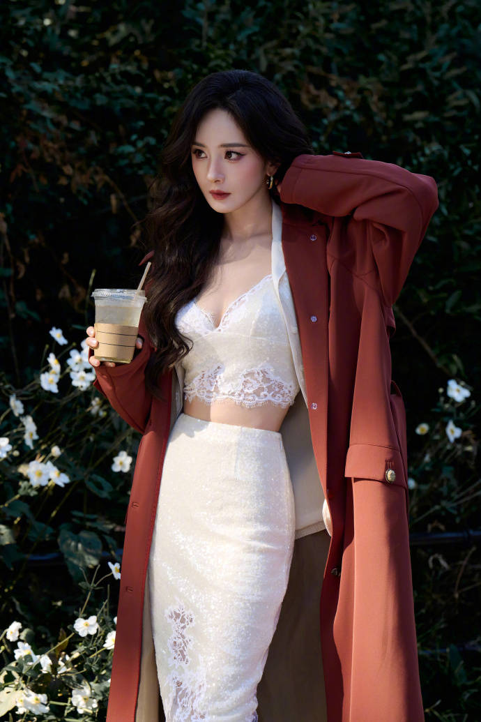 杨幂手托咖啡,非常chill。