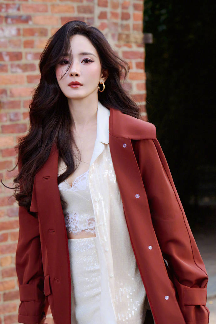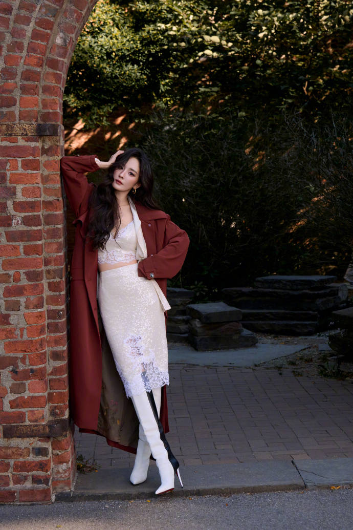 杨幂随性的靠在墙边。