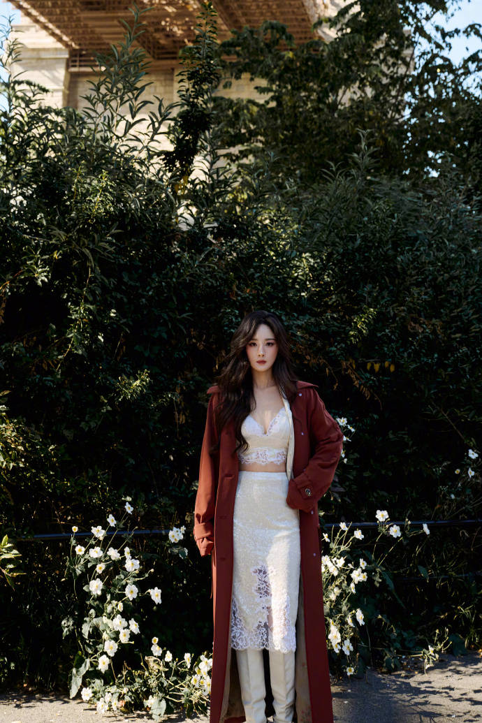 杨幂站在阳光下。