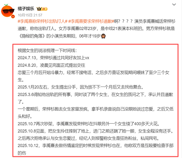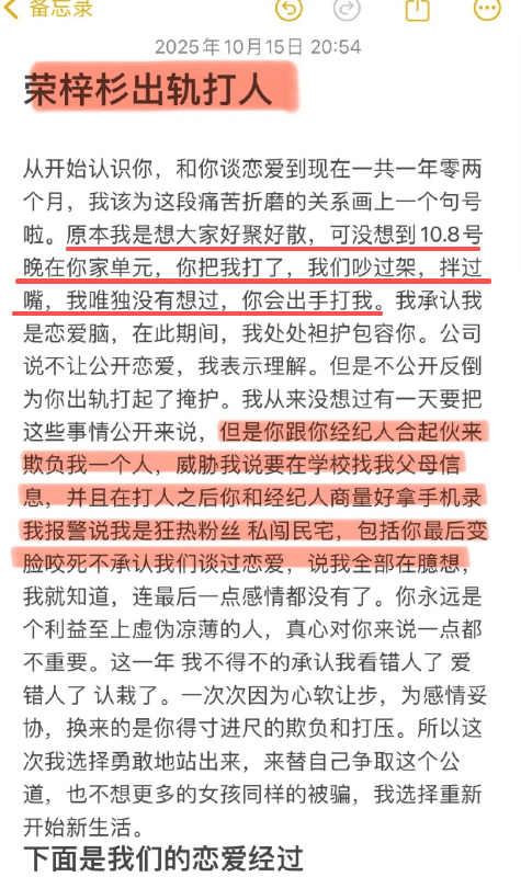 19岁男演员荣梓杉在和她交往期间脚踏4条船,还冷暴力,并殴打和污蔑她。
