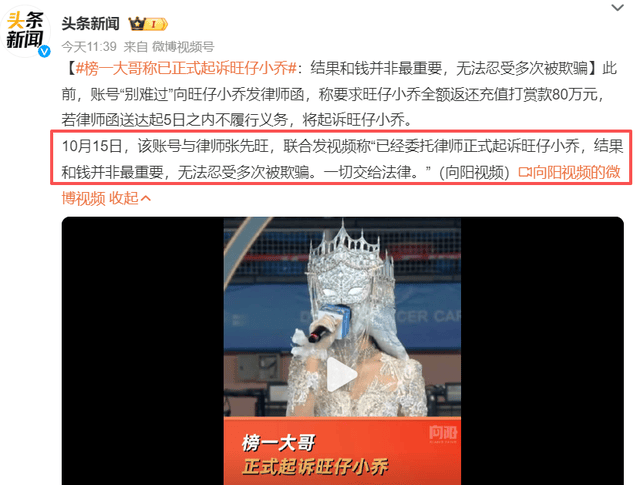 10月15日,榜一大哥李先生已经正式起诉了旺仔小乔,指控他用“虚假承诺”欺骗他刷了80万。