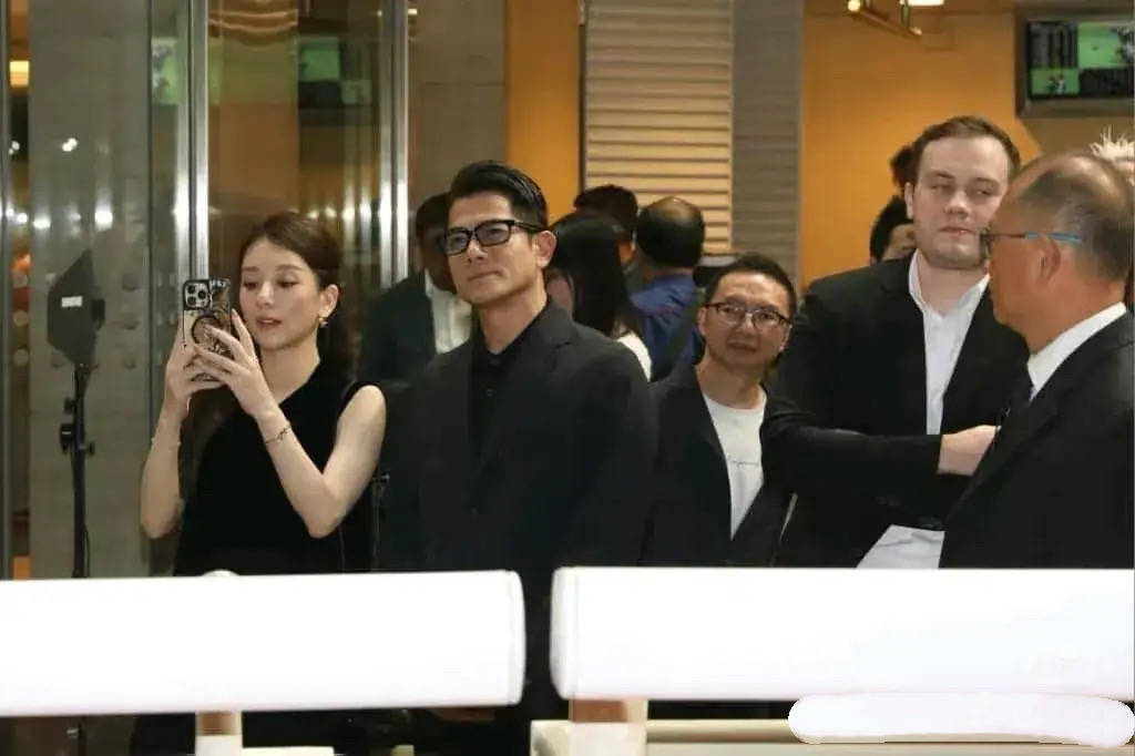 郭富城心情很好,站在方媛身边、脸上时刻都带着笑意。大概是要生三胎了、心里喜不自胜吧,方媛拿着手机拍照,他就安静的陪着。