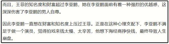 结婚前两人就约定好经济独立,但婚后因为王菲的知名度和财富远超李亚鹏,让李亚鹏一直想要超越女方。于是他不满足于做一个演员,觉得下海经商赚钱远比拍戏来钱更快,这也是他悲剧的来源。