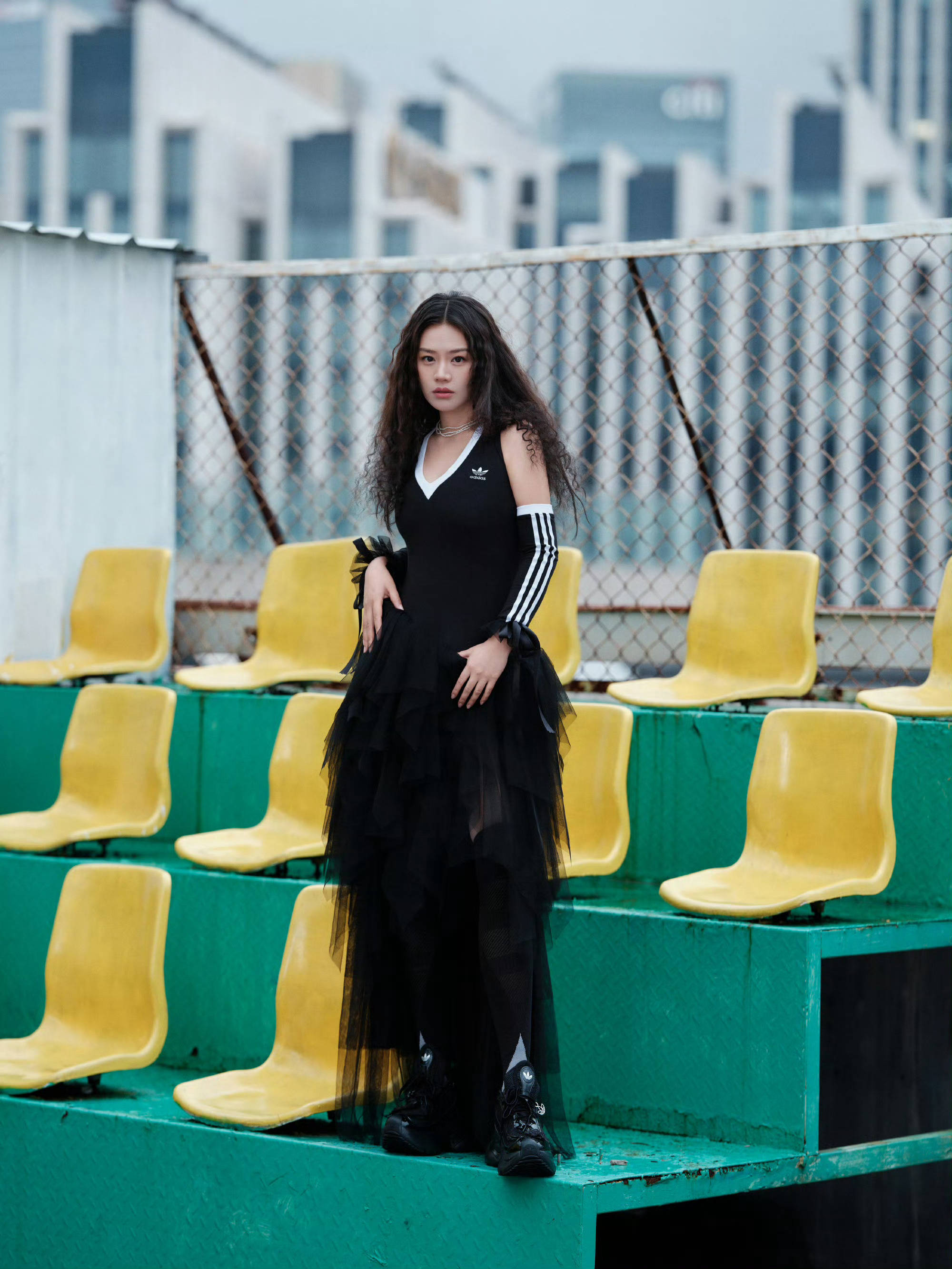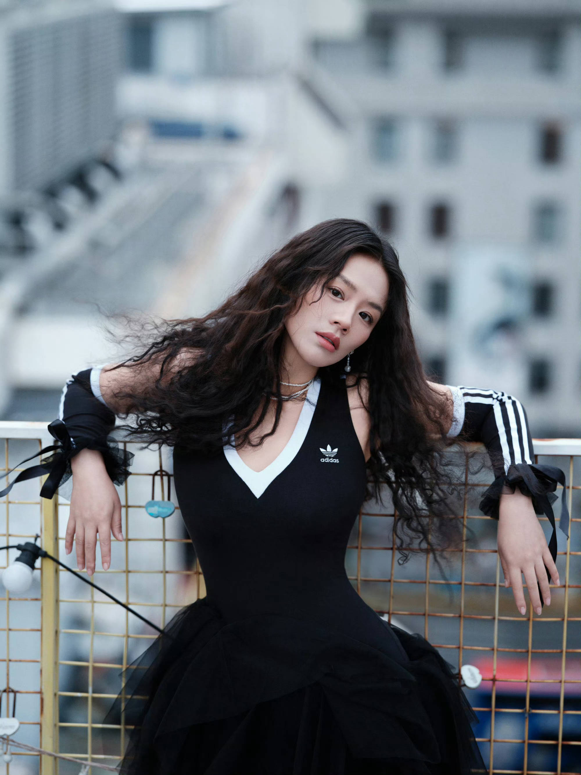 马思纯倚在栏杆前,表现力十足。