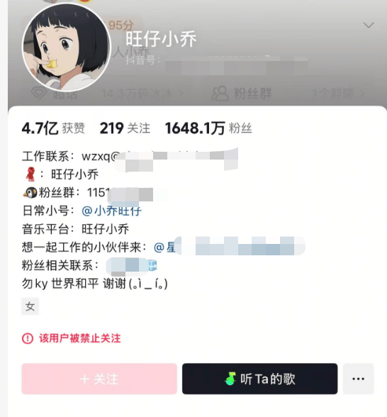 目前,“旺仔小乔”的两个抖音账号,仍是被“禁止关注”的状态。