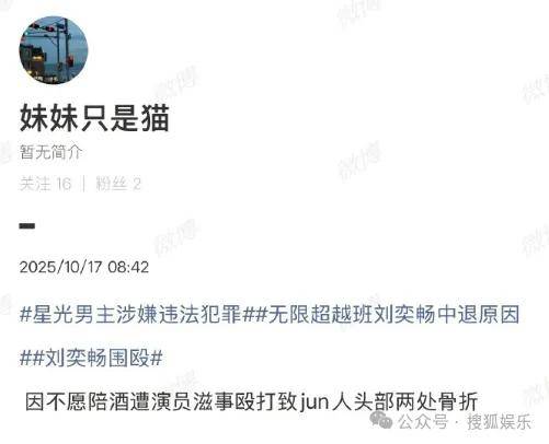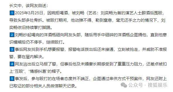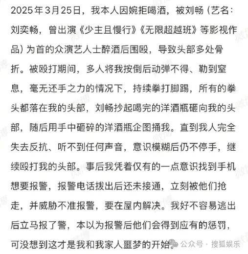 今天,一位网友(id:妹妹只是猫)在微博发长文,控诉3月份因婉拒喝酒被刘奕畅等同伙酒后围殴,看得人目瞪口呆。