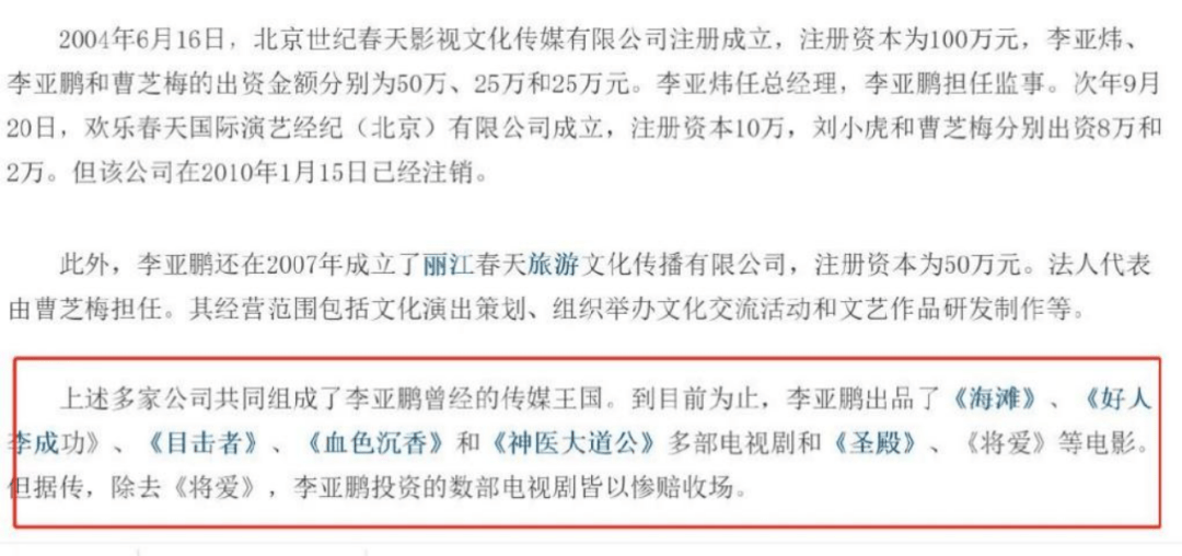 两次创业失败,李亚鹏回到熟悉的文娱领域,和哥哥合开北京美丽春天文化传播公司,结果公司经纪人涉嫌违规,被人实名举报,投进去的钱打了水漂。
