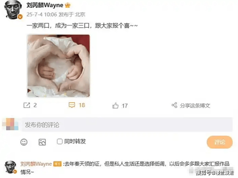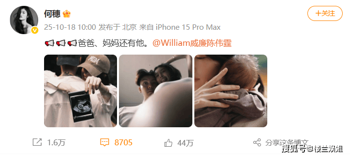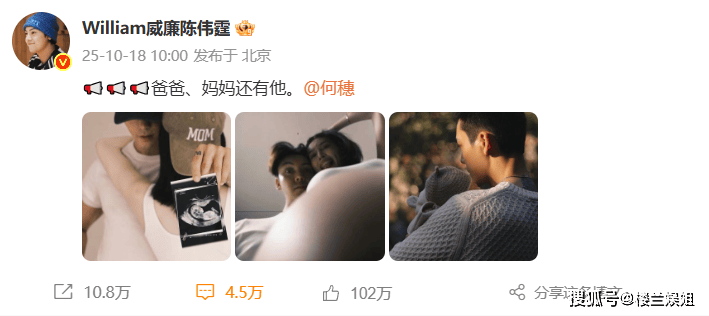 10月18日上午10点,陈伟霆和何穗突然同步官宣生子,配文“爸爸、妈妈还有他”,甩出B超照、孕期合影和新生儿小手照。