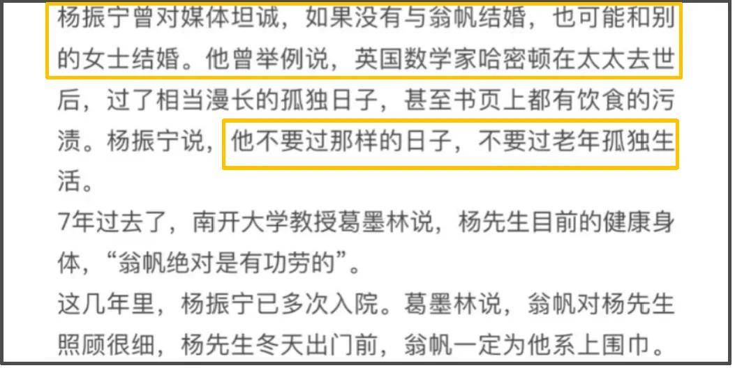 而从杨振宁选择二婚的原因剖析,也能发现他并没有那么在乎翁帆。他曾坦诚“如果没有与翁帆结婚,也可能和别的女士结婚”,相当伤人心。而结婚的目的是“自己不要过老年孤独生活”,言外之意就是找个陪伴者,真实地让人心寒。