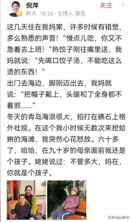 还为了安慰老母亲,说了很多违心的话,次数多了,倪萍就慢慢习惯了和母亲心口不一的相处方式。