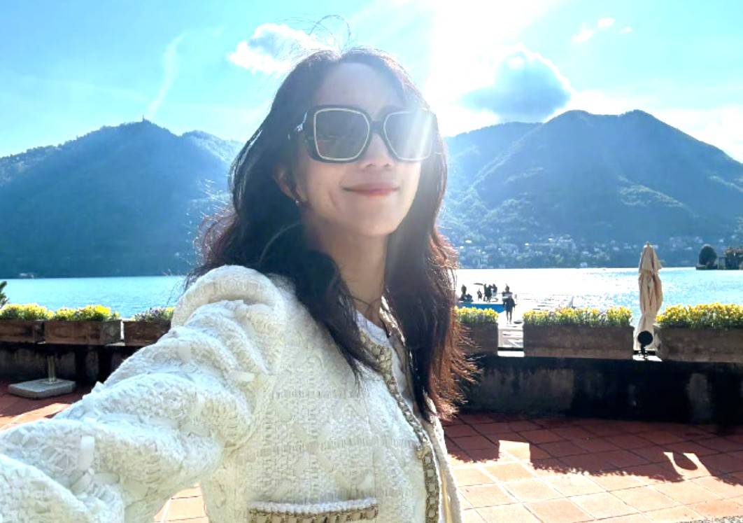 张钧甯站在台阶上,黑裙子+中分直发,手机随手一拍,屏幕差点塞不下那双腿。