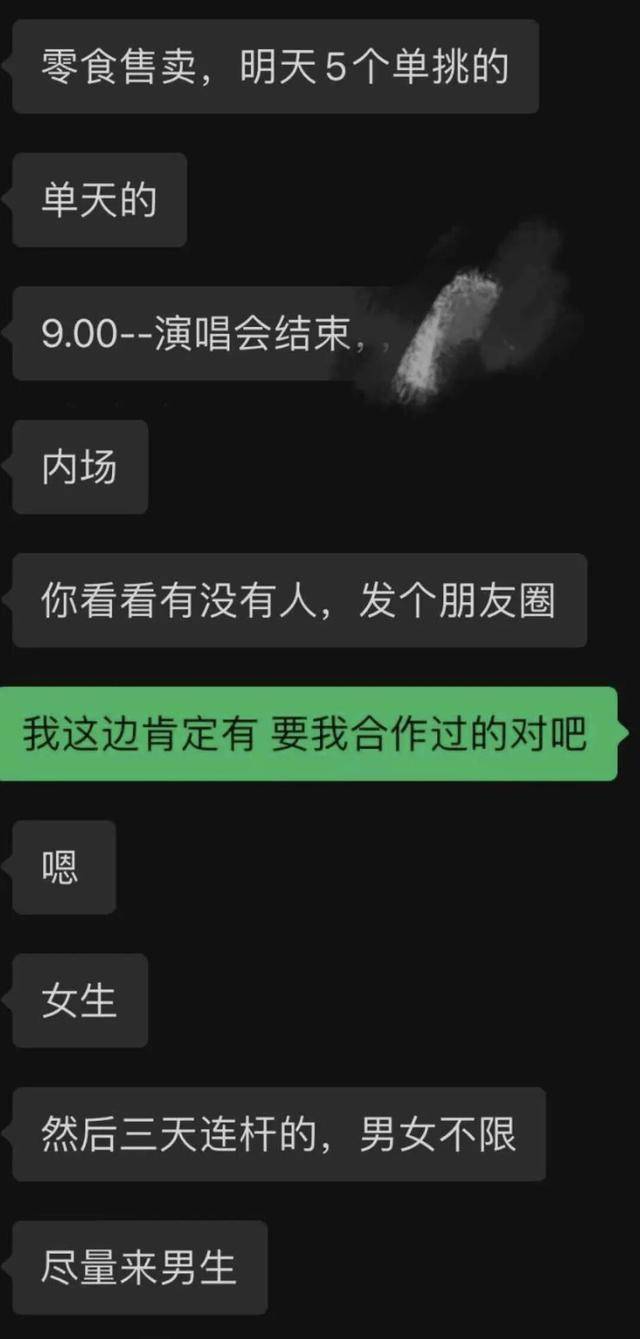 为核实真伪,记者通过几条招聘信息加入了多个所谓的“五月天演唱会兼职群”。群内仍有管理员在发布相关岗位,其中一位“群头”在朋友圈晒出“五月天演唱会卖零食”的兼职内容,并附上与“需求方”的聊天截图,标注了工作时间、报酬等细节,以此证明招聘“真实有效”。