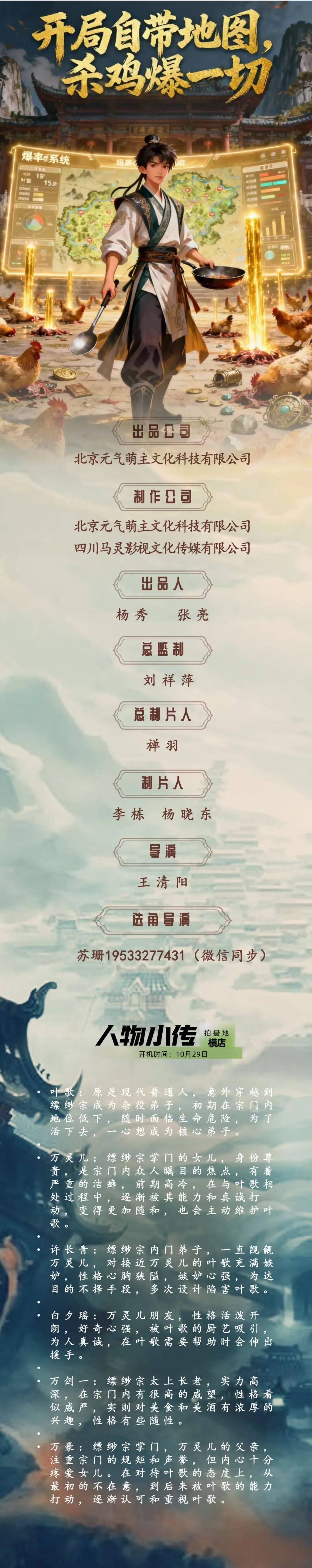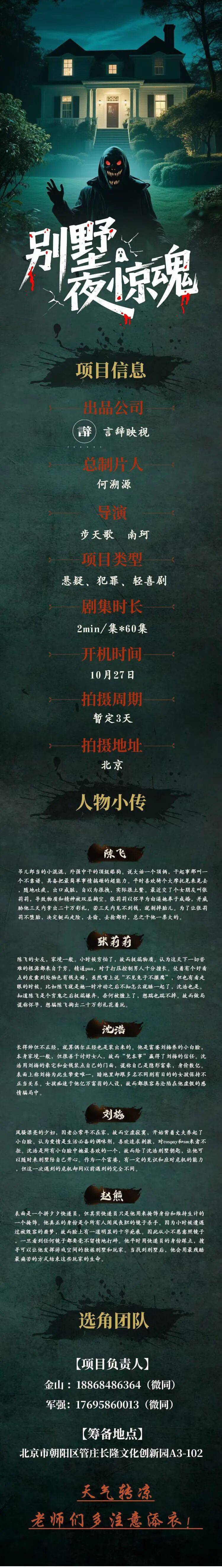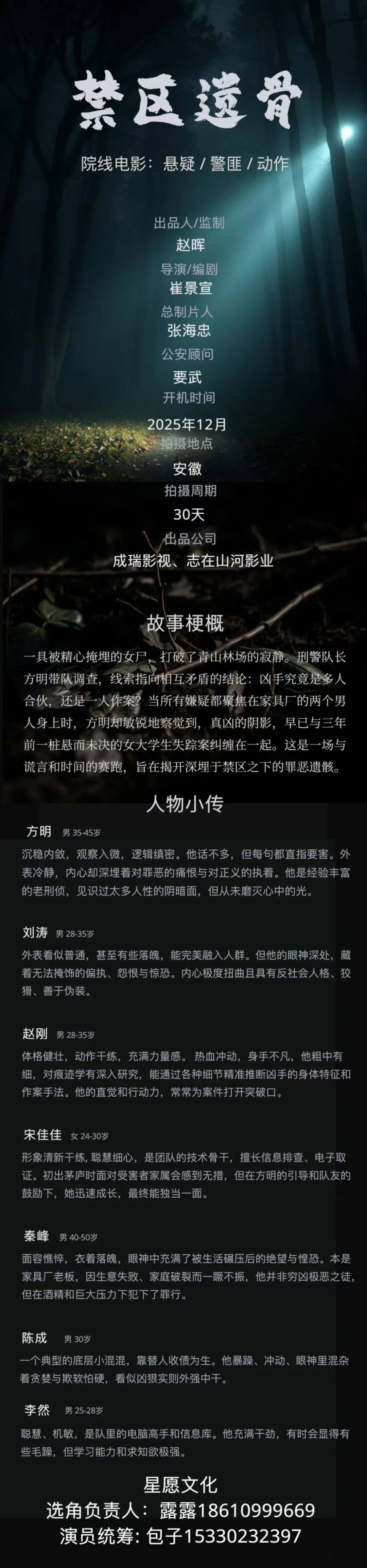 免责声明:戏客Seeker公众号(“本平台”)中全网组讯的信息、内容(“组讯信息”,包括但不限于影视项目名称、项目介绍信息、出品公司信息、导演信息、选角团队信息、拍摄相关信息、联系方式等)均来源于内容信息相关方提供或互联网公开信息。本平台不对组讯信息的真实性、准确性、完整性、及时性、关联性、适用性及安全性提供任何明示或默示的担保。请您谨慎参考或使用组讯信息,并确保您的人身、财产安全,本平台不对您使用或参考组讯信息而造成的后果承担任何责任。