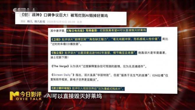 尽管《创》系列拥有深厚的IP底蕴,但《创:战神》上映后,却遭遇了前所未有的尖锐批评。《卫报》直言影片“剧情空洞,角色缺乏魅力,毫无戏剧冲突、危机感或人性价值”;《独立报》批评其“主题深度远逊于1982年的首部,情节晦涩且老套”;《波士顿环球报》认为影片“引入现实世界后,沦为漫威式的‘残杀片’”;《每日电讯报》更是给出了近乎苛刻的评价:“烂到我真希望AI可以直接毁灭好莱坞”。
