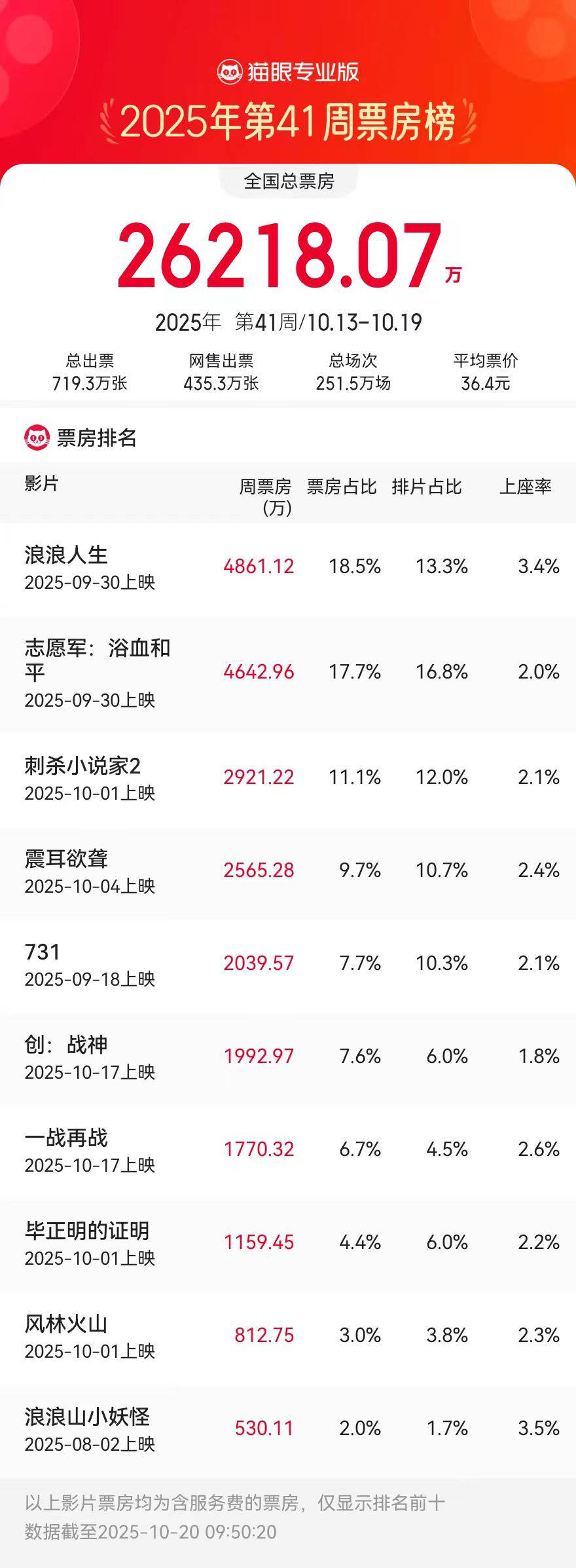 电影《志愿军:浴血和平》第三周收4642.96万居亚,上映20天累计5.73亿;
