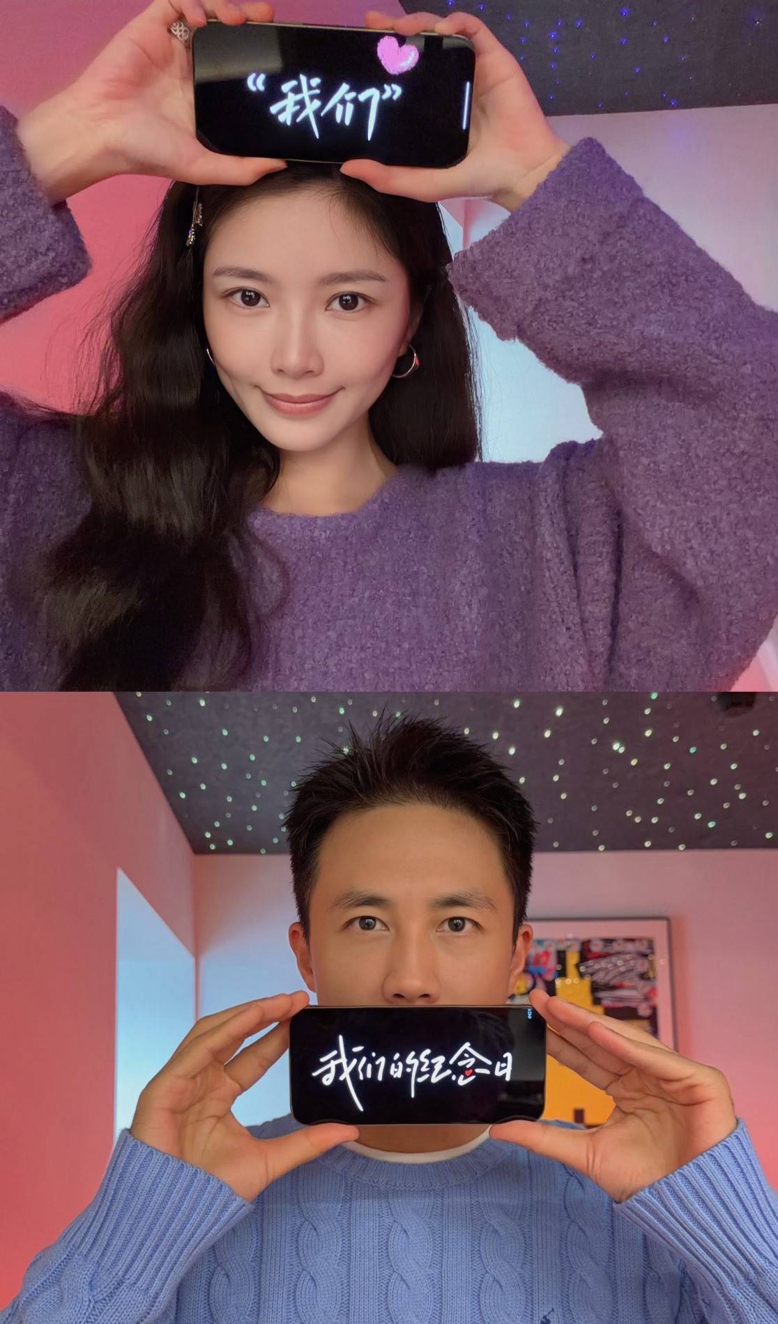 两人举着手机纪念结婚纪念日,甜蜜浪漫。