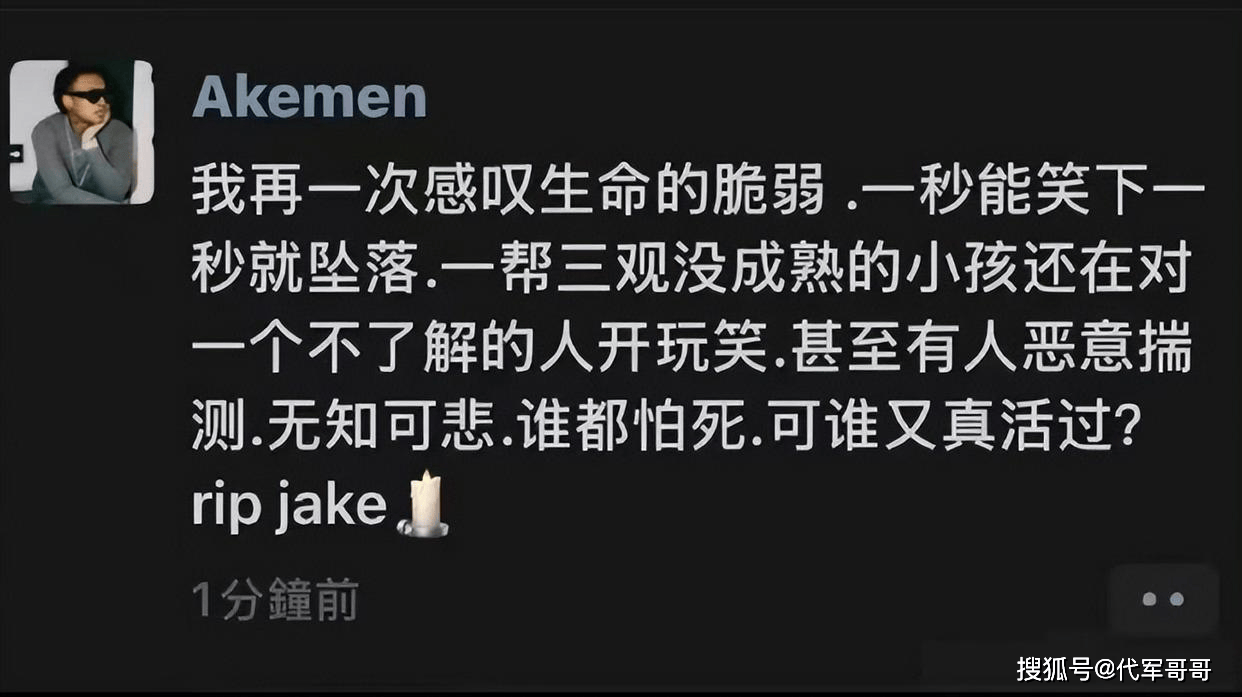 说唱歌手阿卡门感慨 “生命脆弱,一秒能笑下一秒就坠落”,道出行业集体心声。