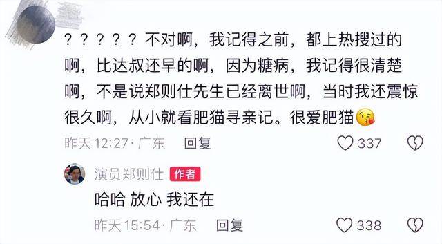 甚至有网友对郑则仕还活着感到疑惑,不敢相信自己之前看到的就是假新闻,该网民在郑则仕的社交网下留言,称自己记得郑则仕的死当时都上了热搜。