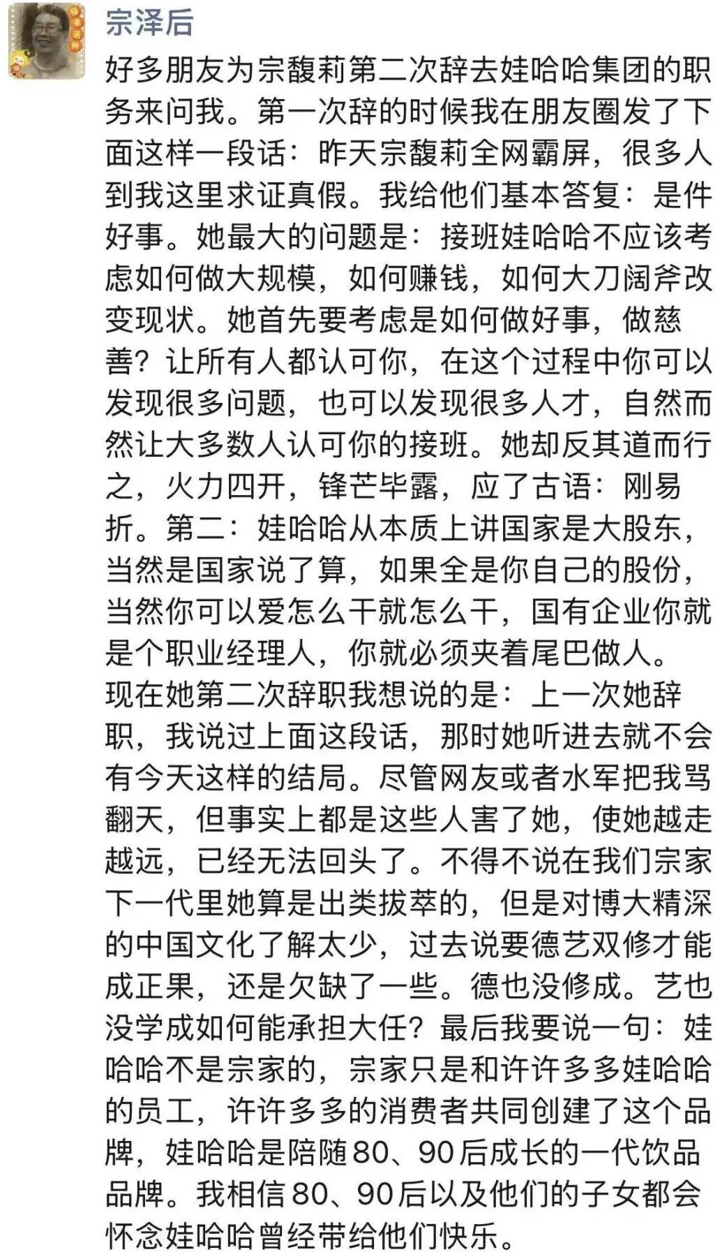 然而舆论的支持也无法扭转时局,9月12日,宗馥莉还是提交了辞呈。