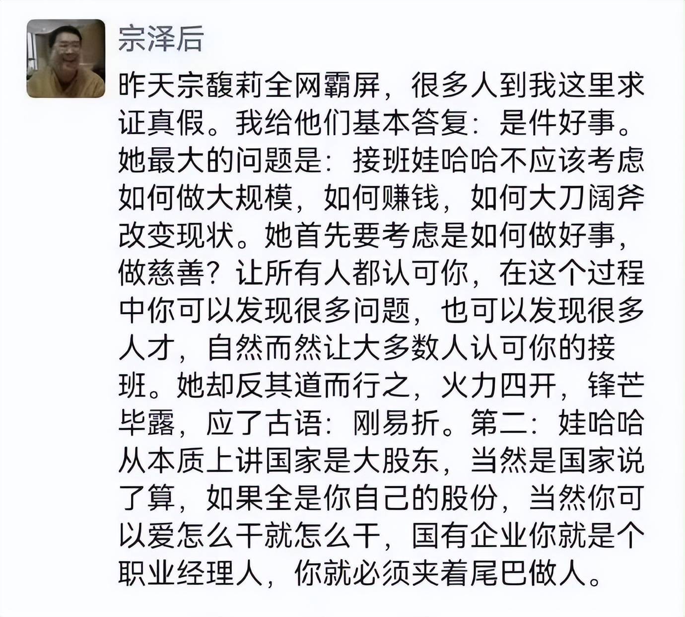首先跳出来谴责宗馥莉的就是她的叔叔宗泽后,他批评宗馥莉锋芒毕露,过刚易折,奉劝她夹着尾巴做人。