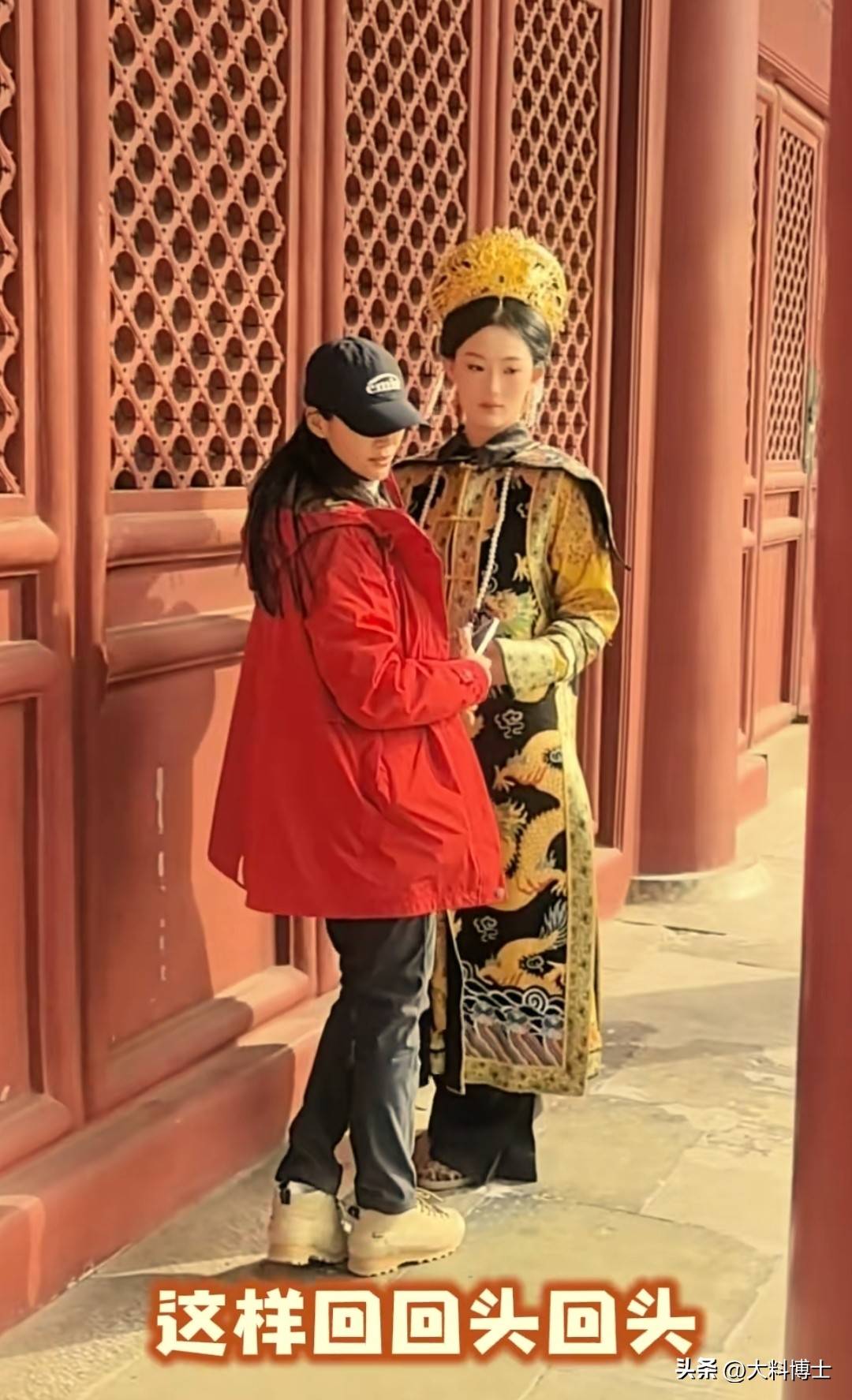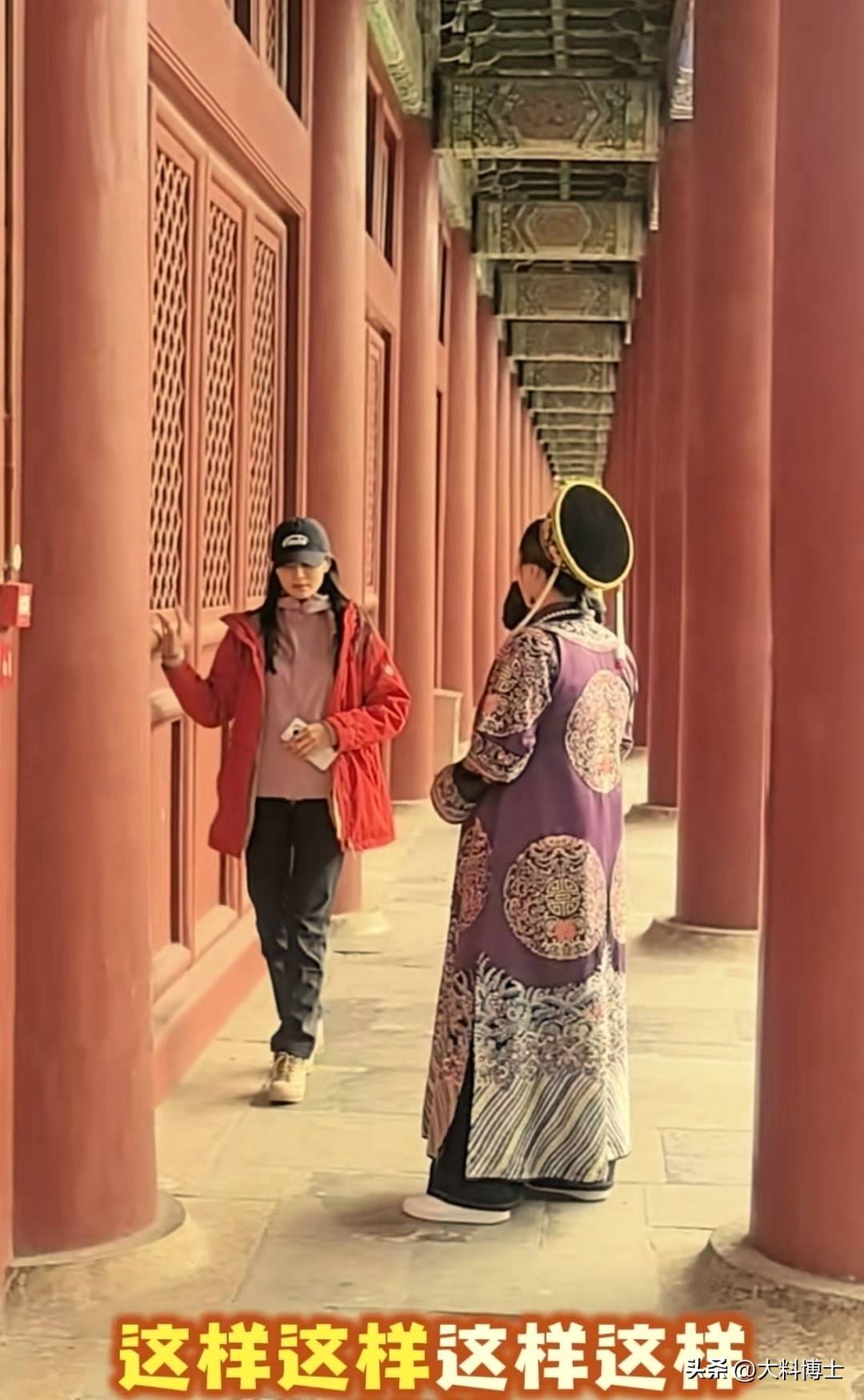 二表妹选了一身紫色的古装,王媛可指导她在廊下红色木门前拍照,她似乎提取了自己当年演纯妃的专业演技,给二表妹示范如何轻抚木门、低眉浅笑。