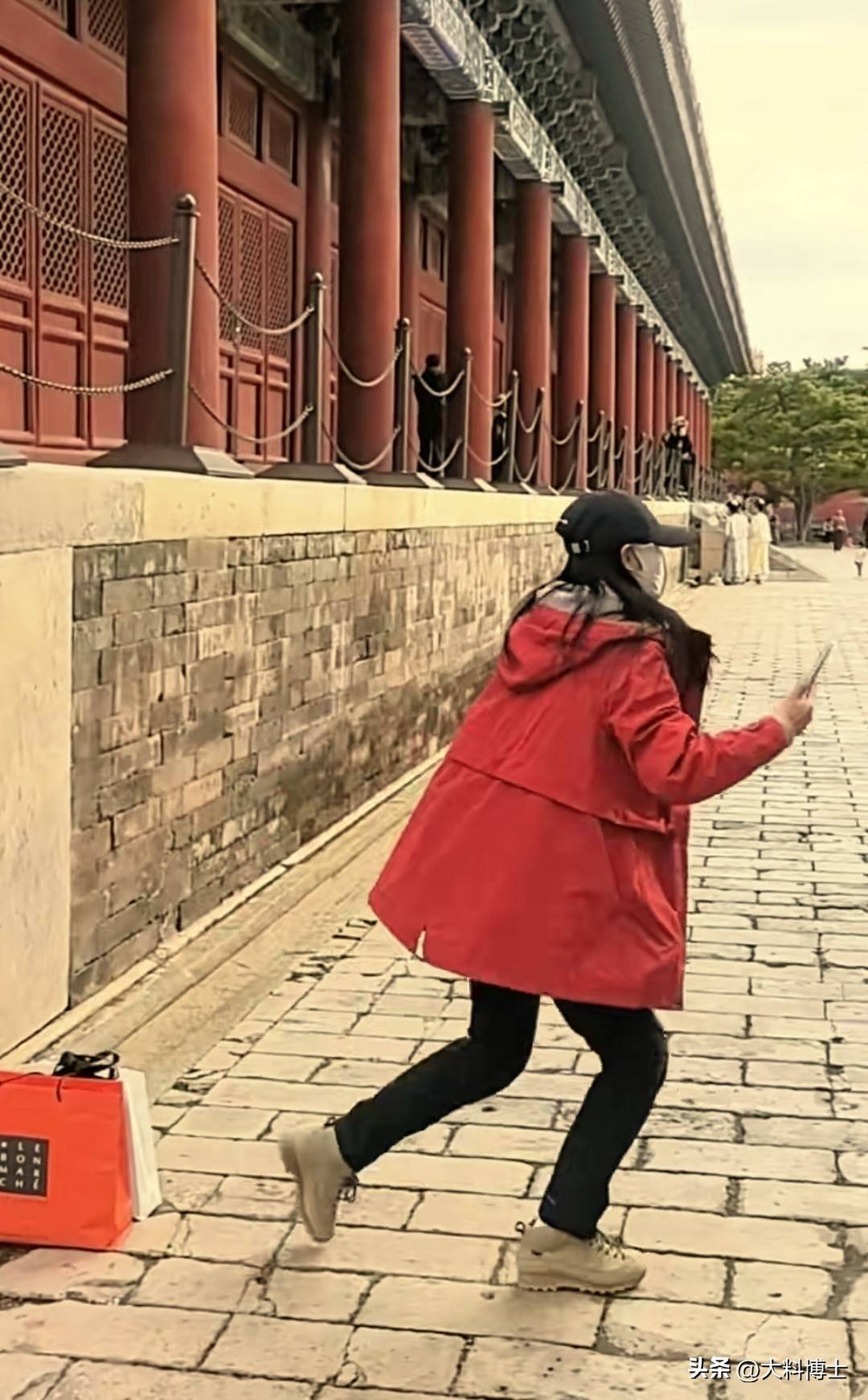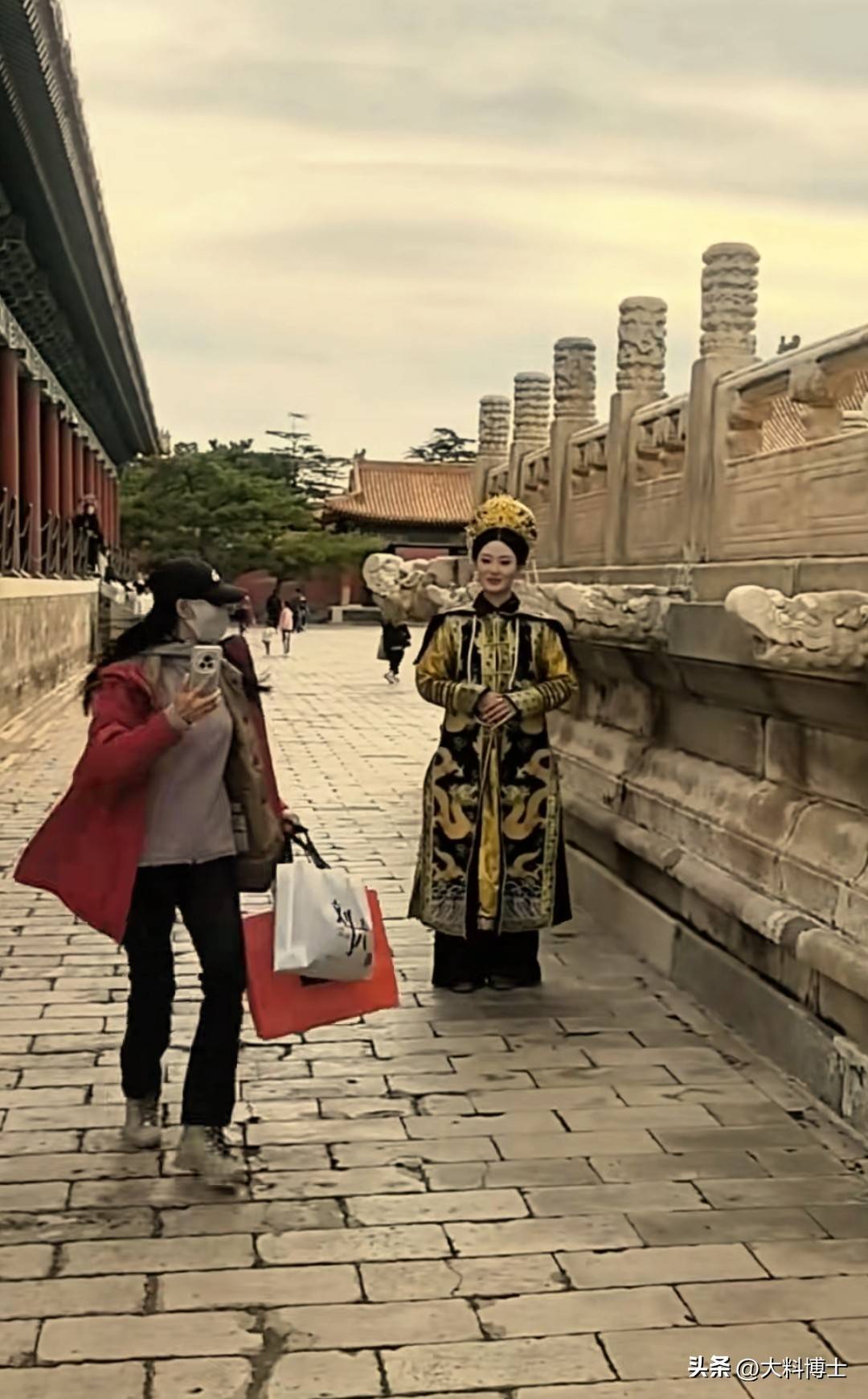 大表妹画好了妆容,换上了皇后的礼服,有点不知所措地站在墙根,‘王媛可一手拿着包包,一手举着相机小跑到大表妹跟前,匆匆将包放在地上,瞬间摆出了拍摄姿势。