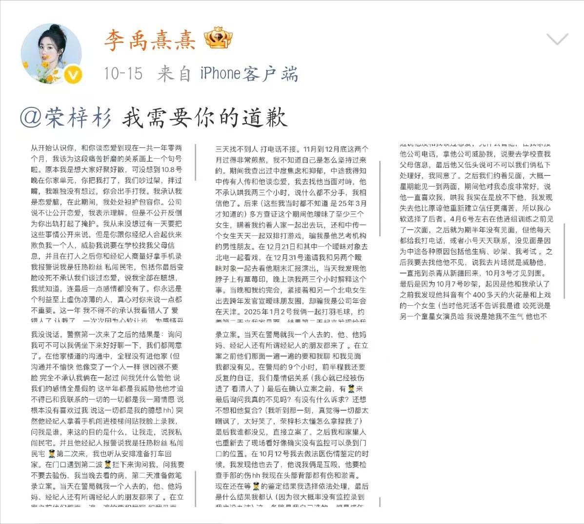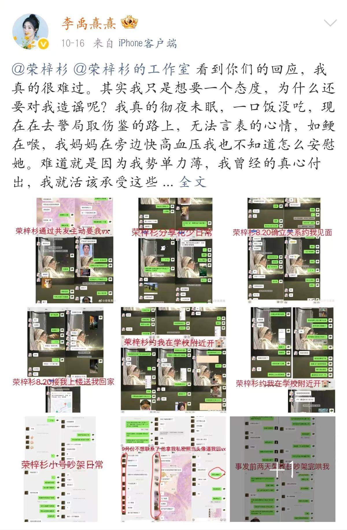 导火索源自李禹熹的爆料,她发布了与荣梓杉的聊天记录和录音,详细还原了两人之间的复杂关系:荣梓杉通过朋友联系李禹熹,两人在恋爱三个月后,他开始实施冷暴力,并与多个女生保持暧昧关系。最终,李禹熹提出分手,而荣梓杉则以谎言回应,声称从未恋爱,并要求公司威胁她。更让人震惊的是,在10月,两人再度见面时,荣梓杉不仅与另一名女生保持联系,还在争执中将李禹熹推倒并踢了一脚,最终报警处理。