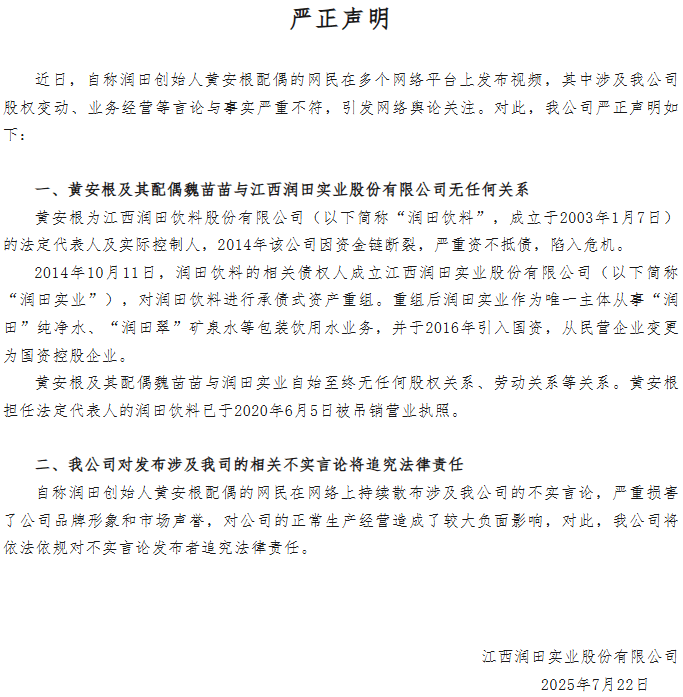 7月22日晚间,润田实业发布声明称,黄安根及其配偶魏苗苗与润田实业自始至终无任何股权关系、劳动关系等关系。