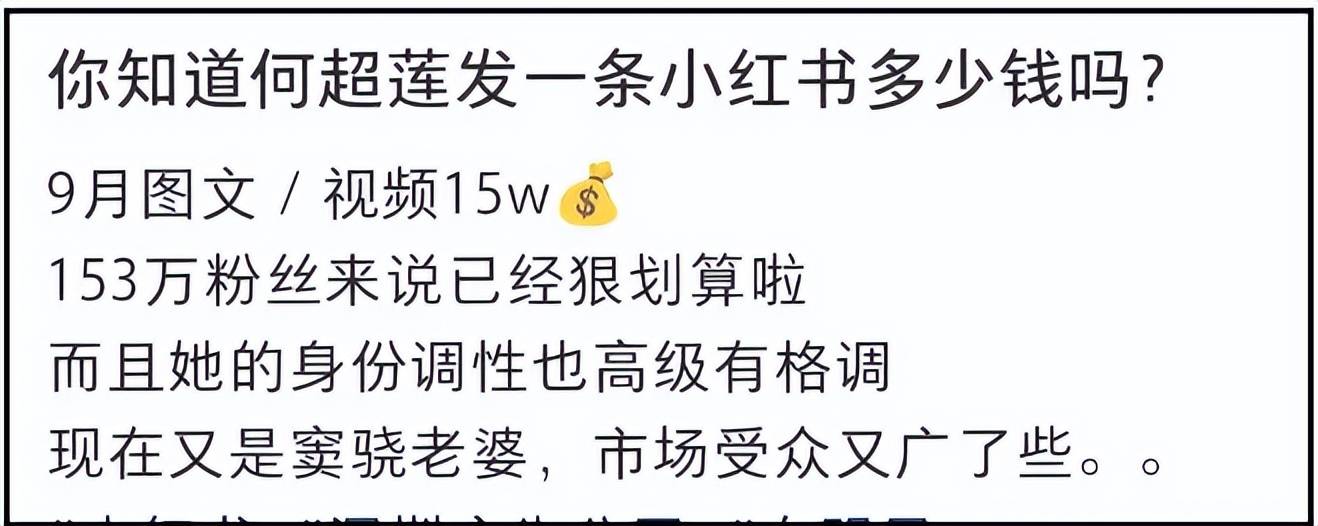 结婚后,何超莲拿下不少商务代言,日常商业活动多到飞起,比娱乐圈的女明星还要忙碌。还有博主爆料,她随手发一条视频都报价15万。都知道娱乐圈水很深,多少女艺人奋力拼搏多年,还未必能拿到这些资源,但何超莲仅靠恋爱结婚,就轻松拥有一切。