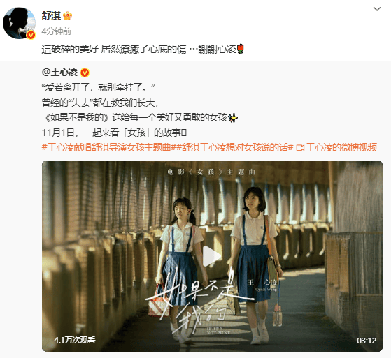 搜狐娱乐讯 近日,舒淇执导的电影《女孩》定档11月1日,该电影主题曲由王心凌献唱,舒淇在社交平台发文感谢,称赞其歌声“这破碎的美好,居然疗愈了心底的伤... 谢谢心凌”