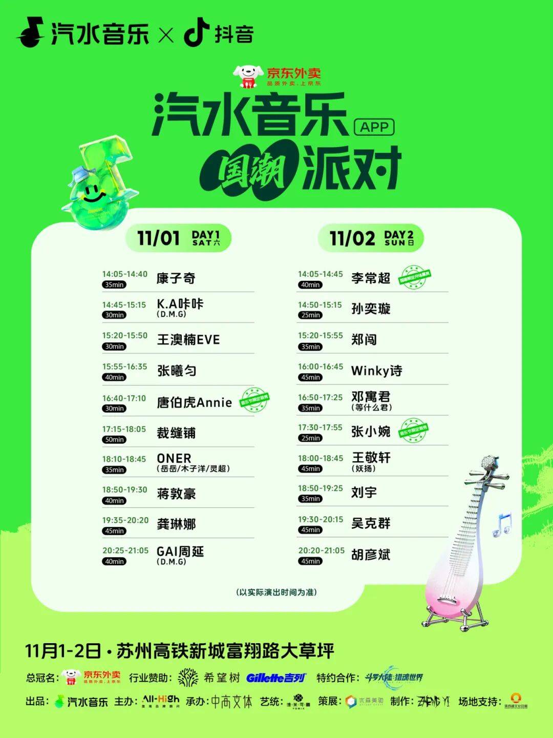 11月1日-2日,汽水音乐国潮派对在苏州高铁新城富翔路大草坪举办,胡彦斌、GAI周延、吴克群、龚琳娜等歌手将出场。