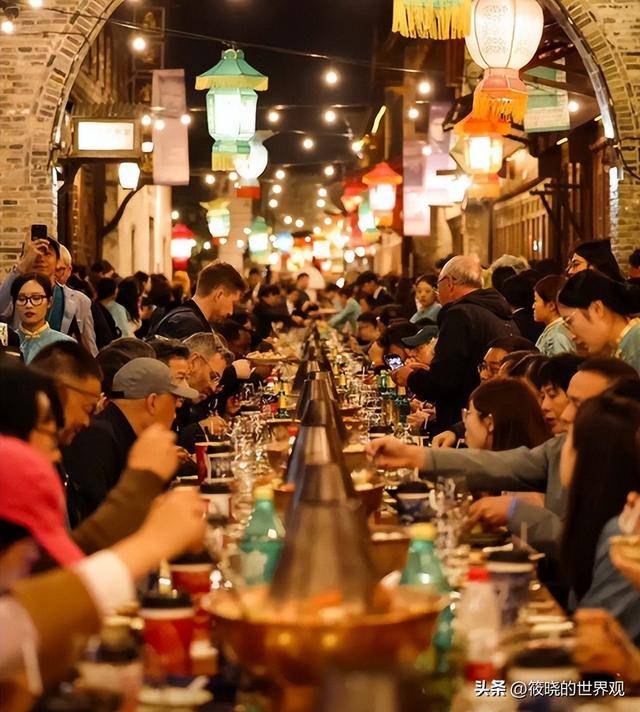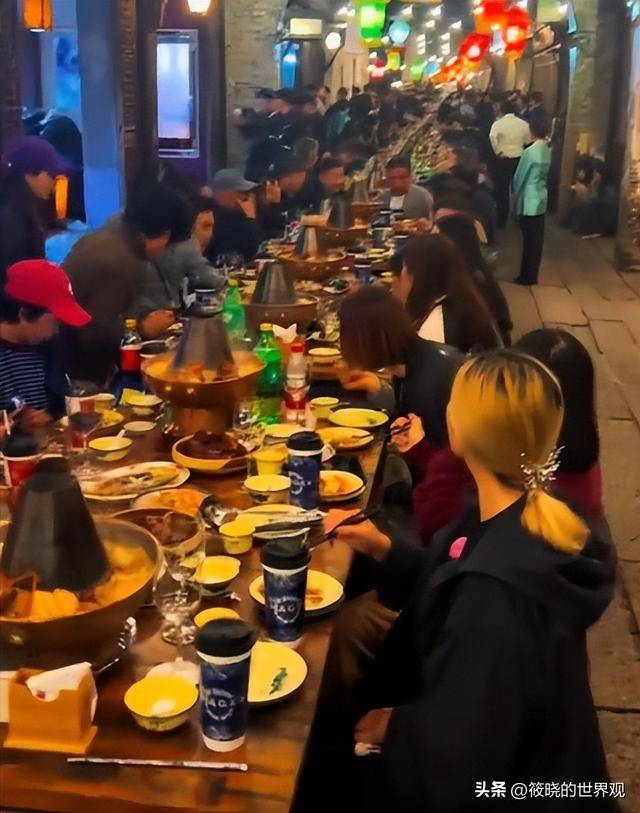 900号人坐在西栅大街上吃饭,明星和普通老百姓挨着坐。