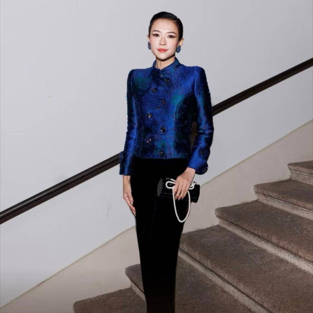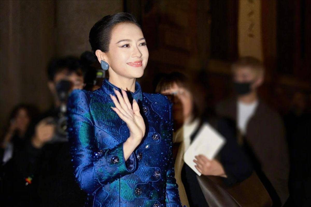 这次大秀中,章子怡穿了一件蓝色的小西装,完美的剪裁勾勒出她极致的身材曲线,
