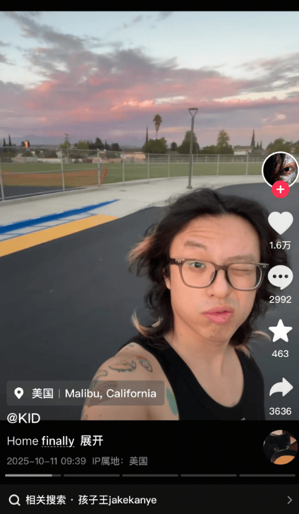 孩子王Jake个人社交媒体发布的最后一条动态于10月11日发布,定位在美国。