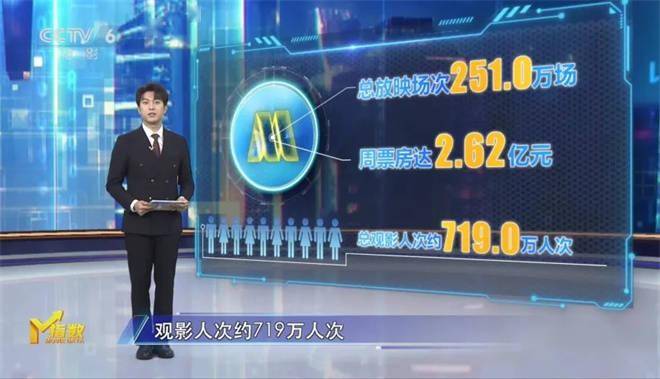 1905电影网专稿据M大数据统计,上周共上映13部影片,大盘数据显示,在过去的一周里,全国院线放映总场次达251万场,周票房达2.62亿元,观影人次约719万人次。
