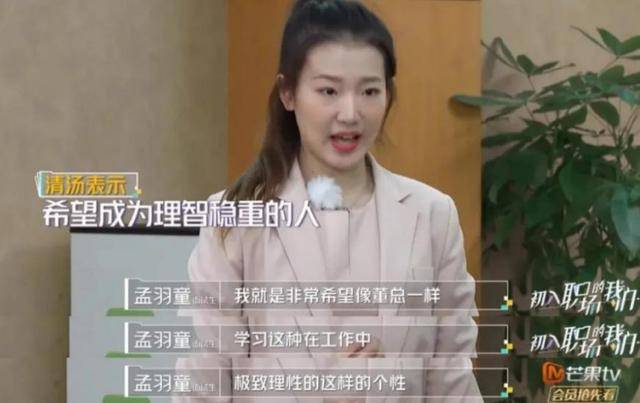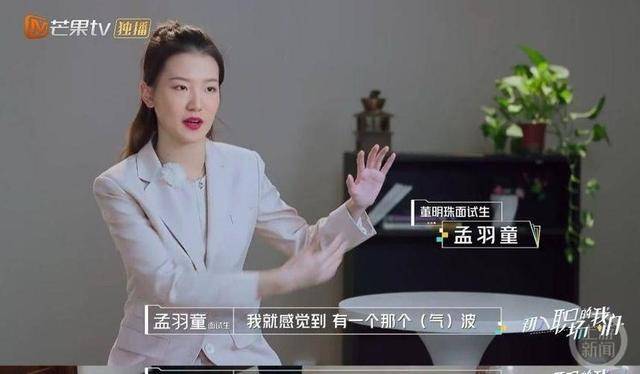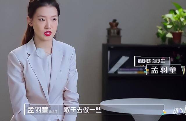 跟老板董明珠介绍自己的履历时,孟羽童声称自己的性格就像“鸳鸯火锅”一样,有“泼辣”的一面,也有“文静”的一面。