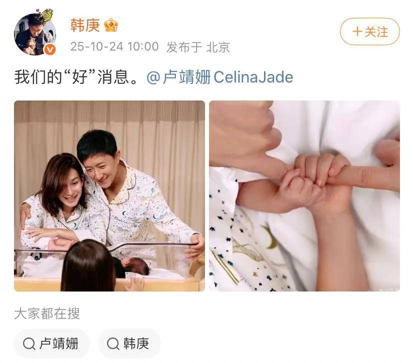 韩庚和卢靖姗都官宣第二胎出生。