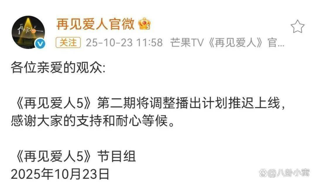 路行的争议迅速波及节目。《再见爱人5》首播次日(10月17日),路行辞去创联控股一切职务,理由是“专注个人业务”。次日,节目组宣布第二期推迟播出,声明称“调整计划”,但舆论普遍认为与丑闻有关。