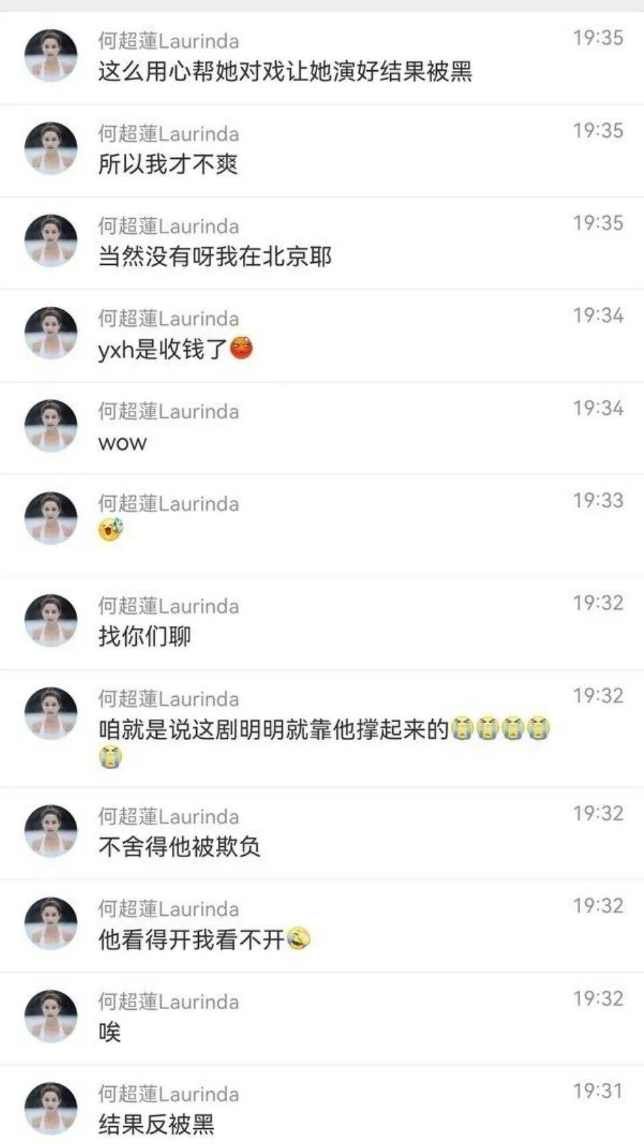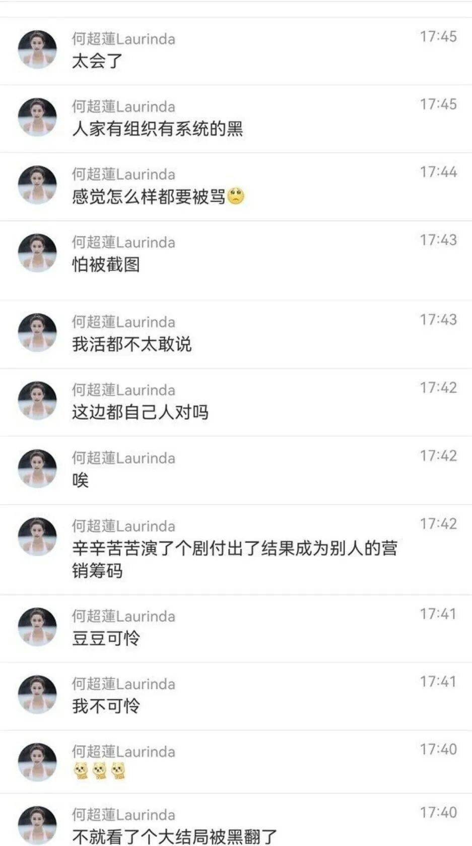 剧宣相关的微博底下,何超莲会抢沙发,秒发“第一个”评论。剧播完之后,她还在粉丝群有过一波迷惑发言,意思是是这部剧全靠窦骁撑起来,不舍得他被欺负,明明用心帮她对戏让她演好结果却被黑。