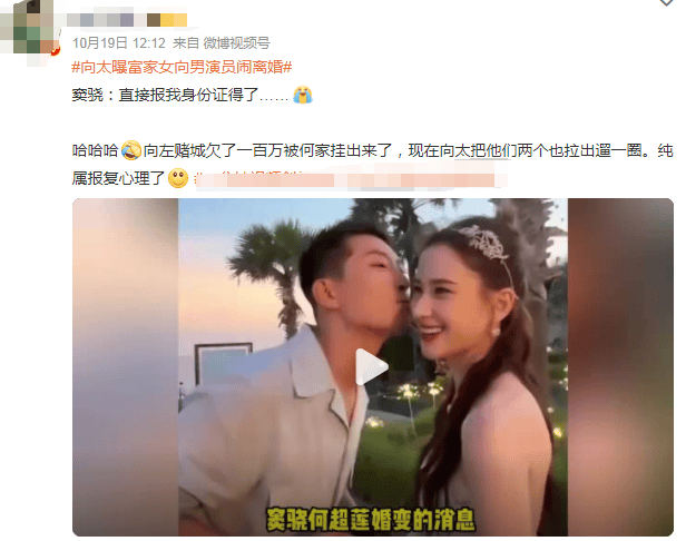 那咱还是按照惯例,先给没吃全瓜的朋友们讲讲,最近到底发生了什么。这波婚变疑云可以从10月18日讲起,向太发布短视频,奉劝女生“绝对不要下嫁”,案例是一位婚姻不顺的富家千金。