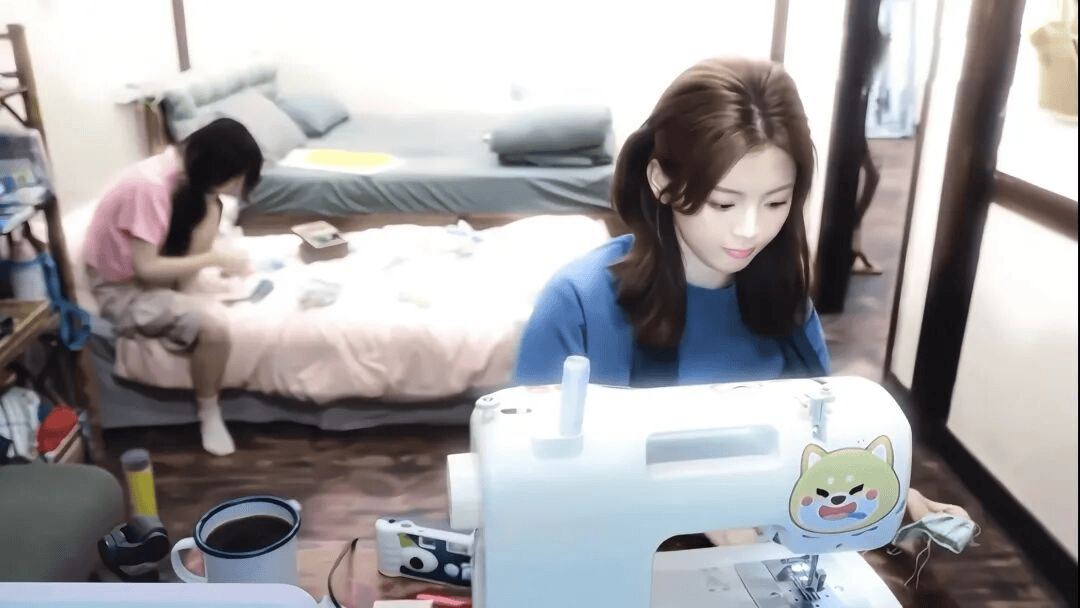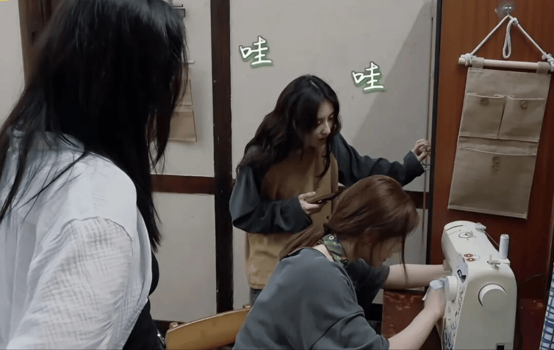 更让人忍俊不禁的是,后来杨超越教张子枫开车时,布料进得太快,缝得歪歪扭扭像麻花一样。她并没有说“再来一次”,反而直接将歪斜的部分剪成了锯齿状的花边,缝出了一个小怪兽,然后笑着递给张子枫,作为“护身符”。