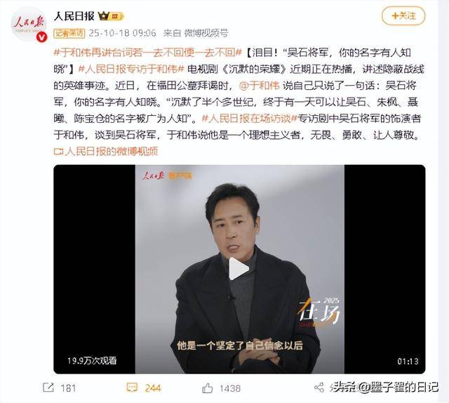 10月18日至19日,短短48小时里,《人民日报》微博账号连续发布4条内容,全都聚焦同一个人,不是顶流爱豆,没有热搜话题,更无绯闻加持,他就是演员于和伟。