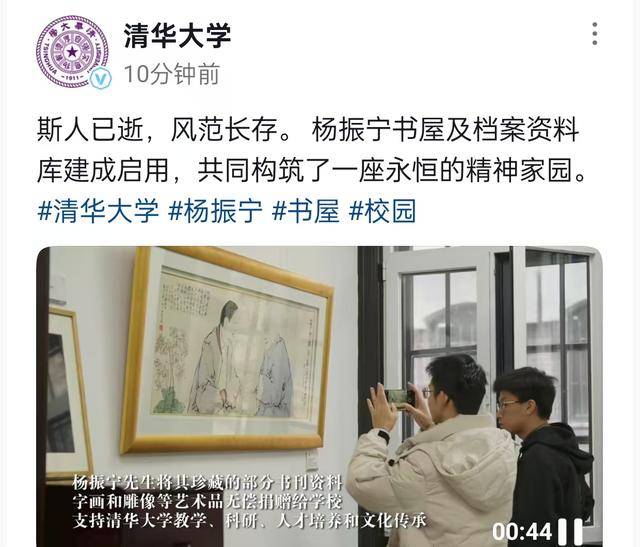 现在,杨振宁书屋及档案资料库已经建成启用,杨振宁将其珍藏的部分书刊、字画、雕像等艺术品,无偿捐献给清华,支持清华的教学、科研、人才培养和文化传承。