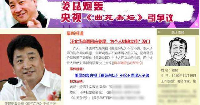 而姜昆为什么突然向这档节目开炮,有消息称,是姜昆在这之前想找汪文华商量,借《曲苑杂坛》这个平台宣传相声大赛,安排新人演出,但是却被汪文华给拒绝了。