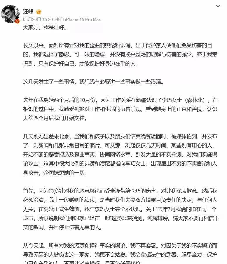 2024年5月20日那天,汪峰在社交平台上发了一篇长长的文章,详细说了他和森林北(其实叫李巧)是怎么认识的,还正式宣布两人已经开始交往了。