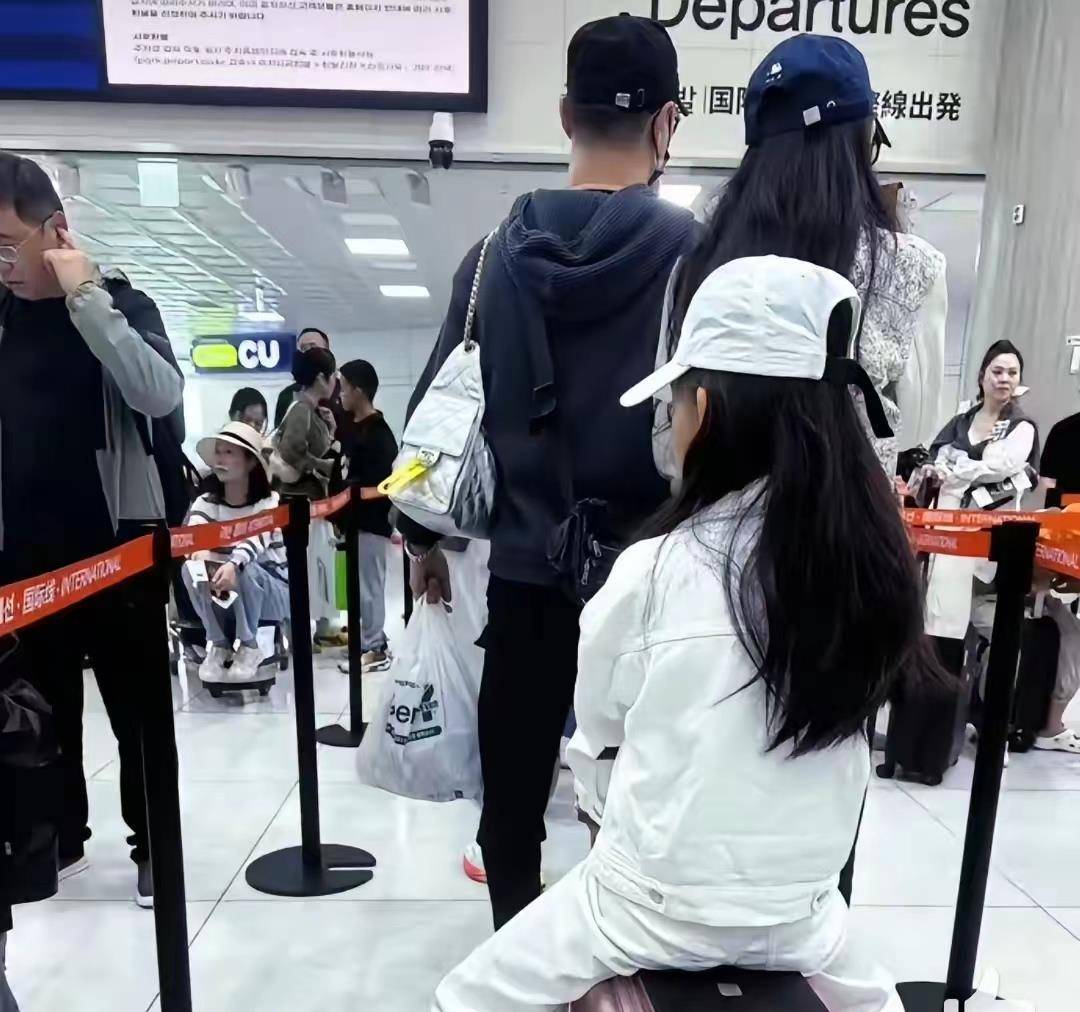在不远处推着行李车的地方,醒醒的表现还挺惹人喜爱,她穿着白色运动衣,头顶戴着一顶白色棒球帽,乖乖坐在粉色行李箱上,一手握着个儿童手表,安静得让人觉得挺稚嫩。