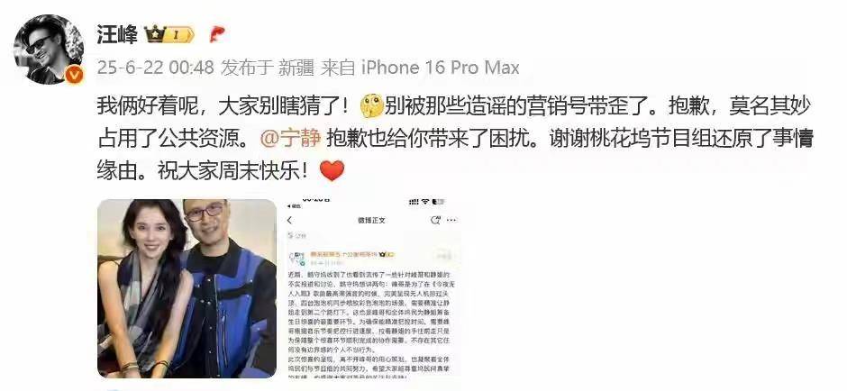 汪峰那边也没闲着呀,遇到“节目牵手宁静”的误传,他没有写那些冗长复杂的公关稿,反倒干脆地发了一张和森林北的合照,明显是在告诉大家别胡猜了。
