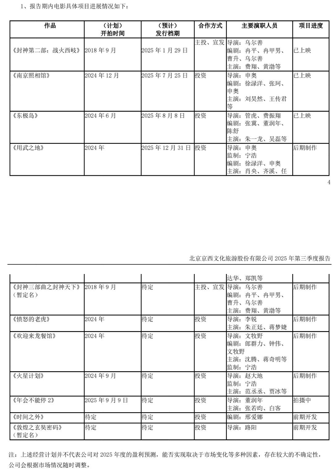 另外,北京文化参投的《用武之地》已定档12月31日跨年上映,《封神第三部》《欢迎来龙餐馆》《愤怒的老虎》《火星计划》在后期制作中,《时间之外》《敦煌之玄奘密码》在前期开发中。