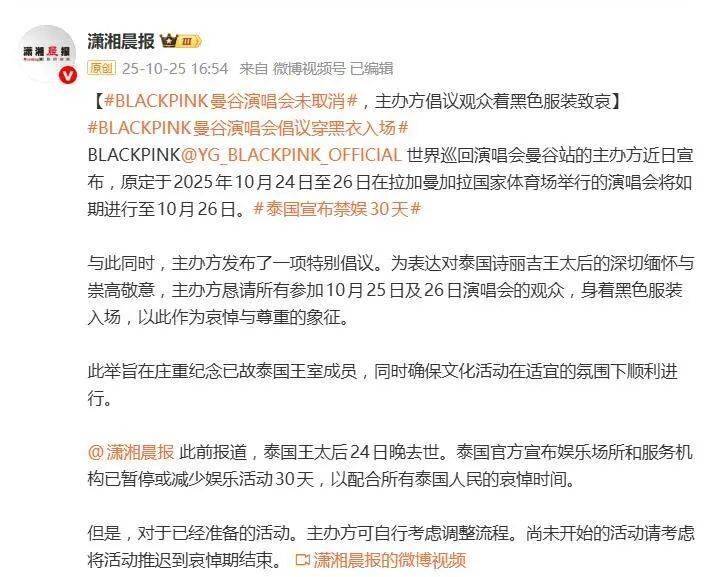 这一决定,让一场顶流女团的狂欢盛宴,瞬间增添了庄严肃穆的色彩。据公告,泰国诗丽吉王太后于10月24日晚逝世,享年93岁。为此,泰国官方宣布全国进入为期30天的哀悼期,并呼吁娱乐场所暂停或减少娱乐活动。面对这一突发状况,已筹备多时的BLACKPINK演唱会走到了是否取消的十字路口。
