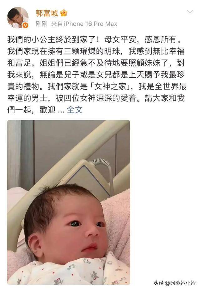10月22日,郭富城第三次迎来女儿的降生,这位60岁的天王幸福高调的宣布“我们的小公主终于到家了”,并将自己的家称为“女神之家”。